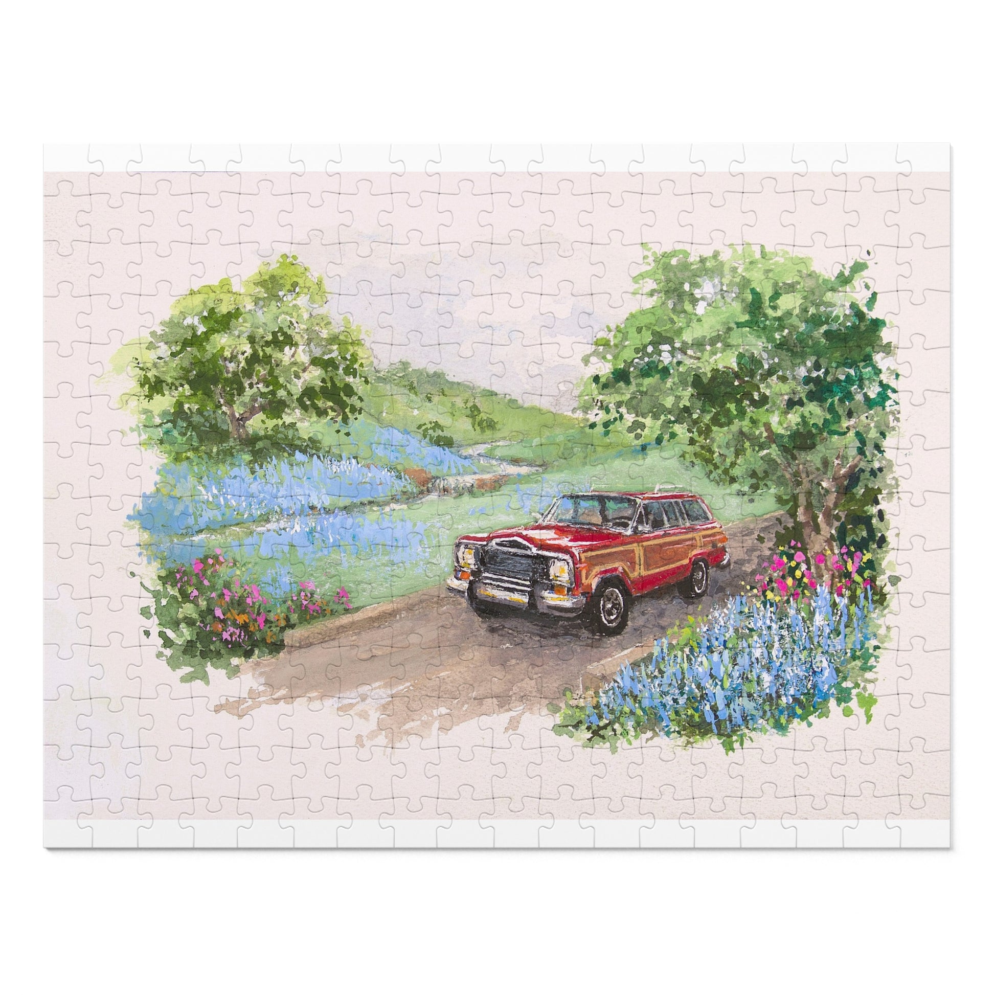 A vintage Red Wagoneer winds along a country road. The glossy, vibrant print brings every brushstroke and tiny highlight to life, while the sturdy pre-die-cut chipboard pieces fit together with satisfying precision. Packaged in a white tin featuring the finished image, this puzzle travels easily and stacks neatly on a shelf until you’re ready to open the tin and start assembling. Work slowly along the edges, place the wood-grain and window details, and watch the scene unfold — reminds you of spring when all the flowers are in bloom.